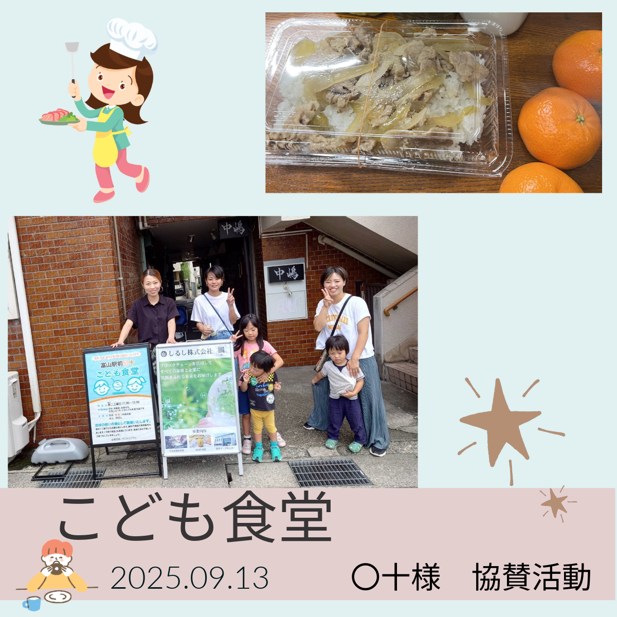 2025年9月13日(土)、〇十様が主催された「こども食堂」にて、社会貢献活動を行いました。