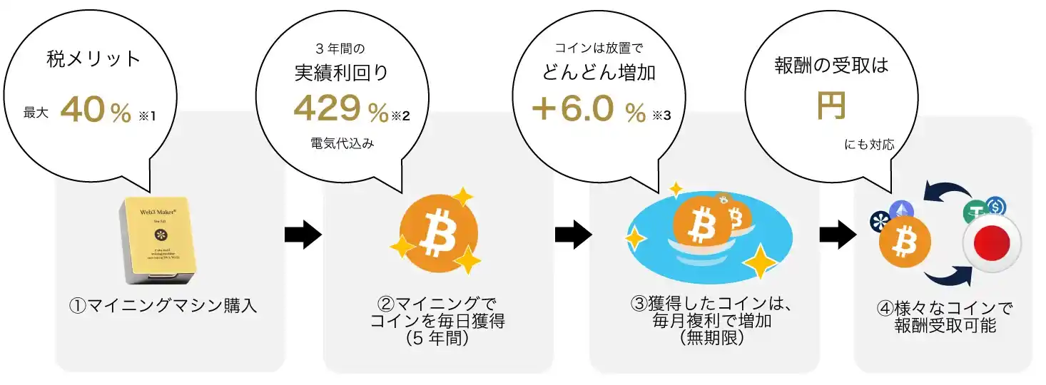 当社のマイニングマシン「Web3 Maker®」を使用することで毎日収益を獲得が出来ます。